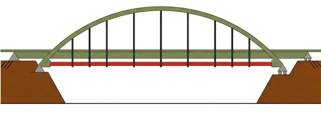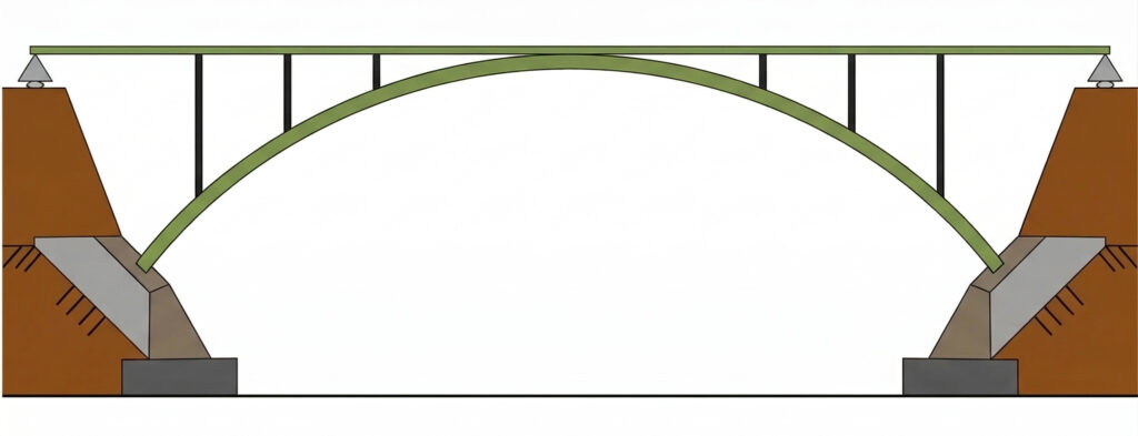 アーチの両端を引張部材(タイ)で結び、外に広がる力をタイが受け持つ形式です。基礎に水平力が発生しないので、地盤の弱い場所でも設置できます。