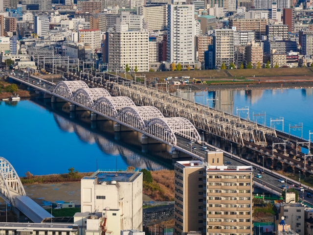 淀川にかかる十三大橋は、昭和7年に開通したアーチ橋で、日本では珍しい5連のタイドアーチ橋の構造をしています。