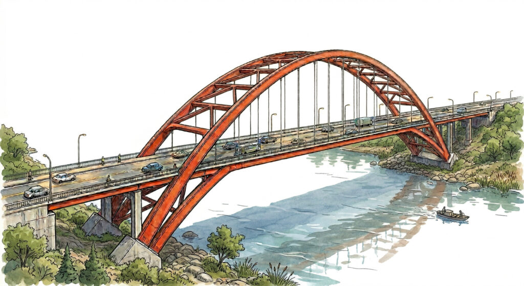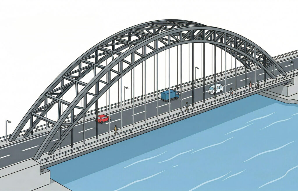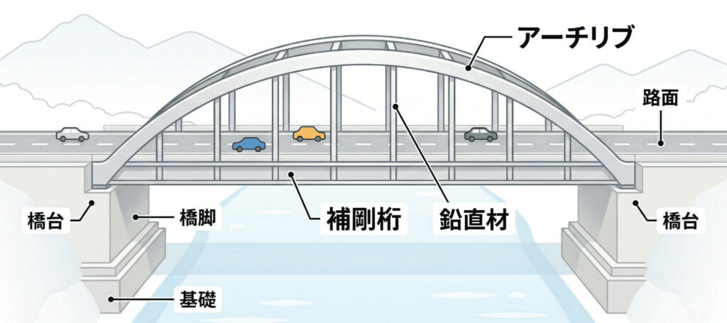 アーチ橋は、いくつかの重要な部材が組み合わさって構成されています。代表的な部材の名称とその役割について解説します。