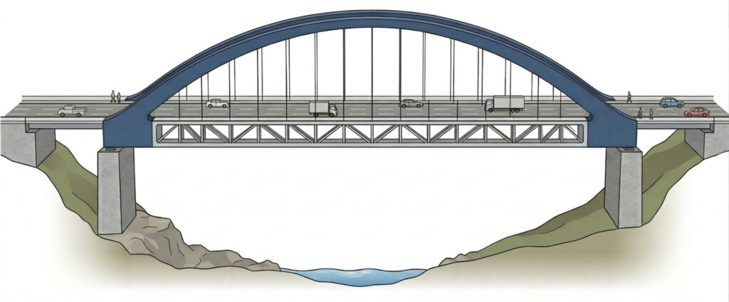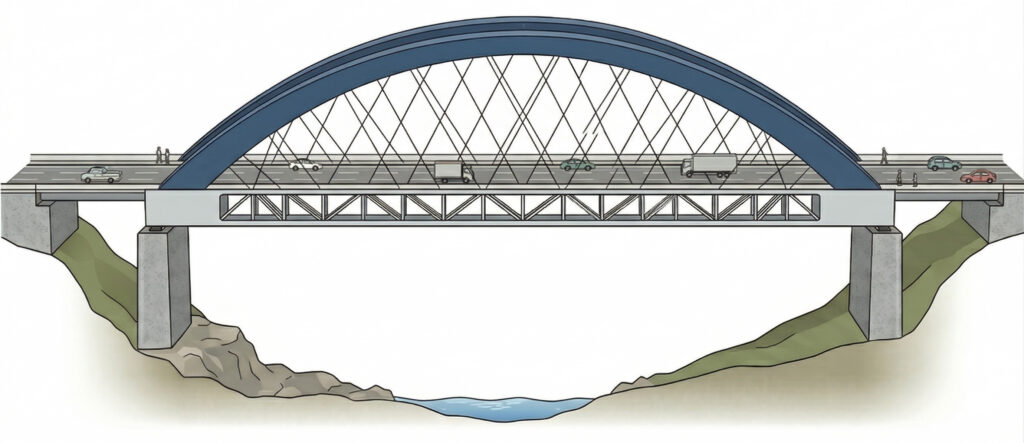 橋桁とアーチリブが曲げ剛性を持ち、網目状にケーブルを組んだ形式です。力を分散させることでたわみや振動が少なく、近年はこの形式を採用するアーチ橋が増えています。