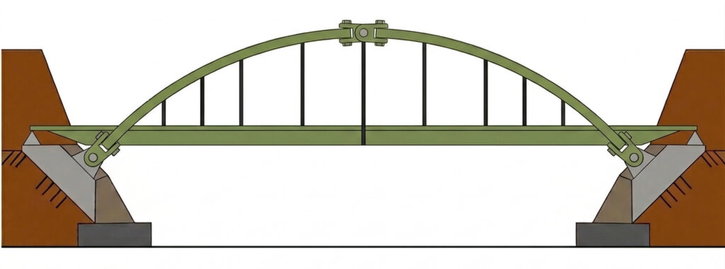 両端に加えて、アーチの頂上部分にもヒンジを設けた形式です。基礎の片側が沈下しても、3つのヒンジが変形して対応できるため、地盤がやや不安定な場所でも架設ができます。