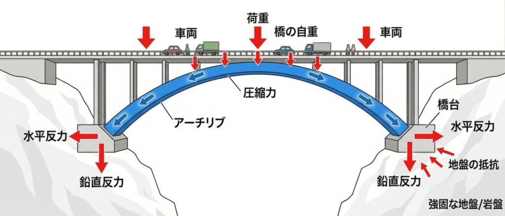 アーチ橋は、荷重を圧縮力に変えて下部に流すことにより、土台には押し広げようとする強い力(水平力)が発生しています。橋台を大きくすると膨大なコストがかかってしまうため、水平力に耐えられる強靭な地盤にアーチ橋を建設するのが現実的です。