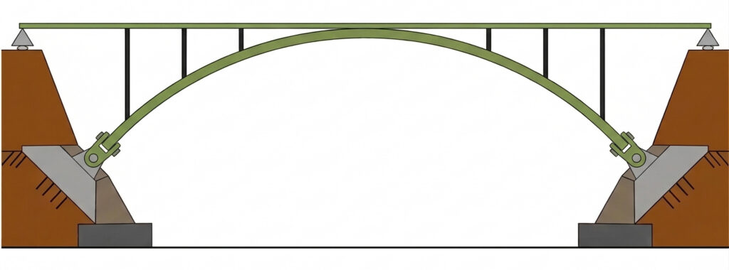 両端の支点にヒンジを設けた形式です。温度変化による鋼材の膨張や収縮などの影響を緩和できるため、長大なアーチ橋の多くで採用されています。