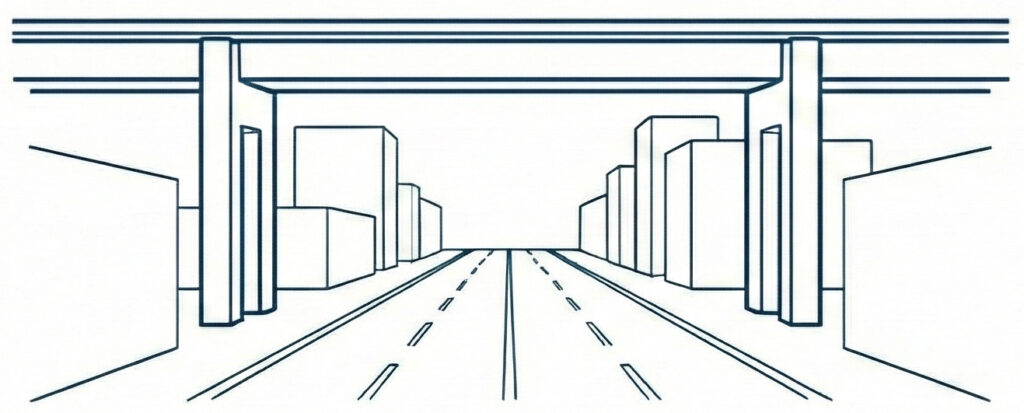 ポータルラーメン橋とも呼ばれており、もっとも基本的で都市部ではよく目にする形式です。上部の桁と左右の橋脚が直角に剛結し、側面からみると門(ポータル)の形をしています。