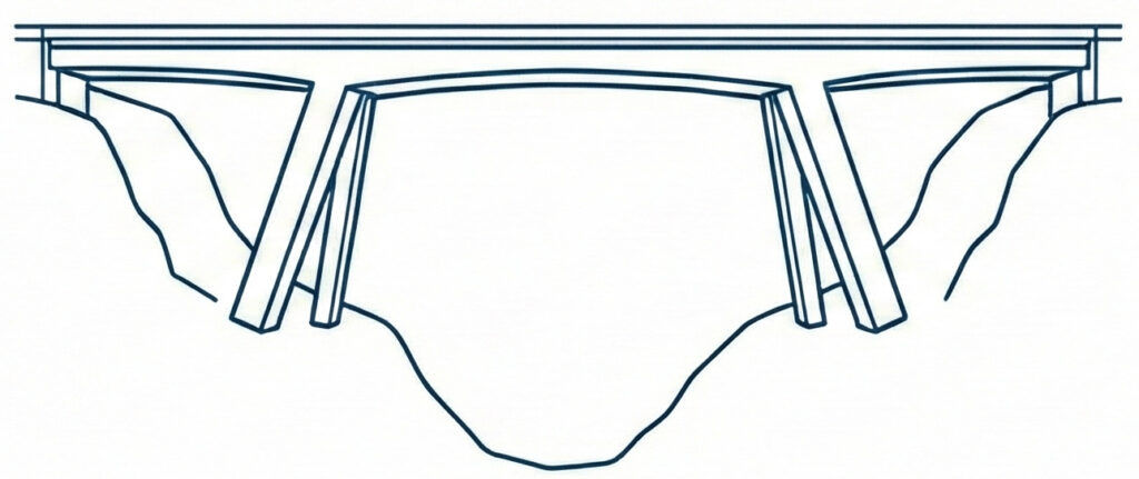 斜めの橋脚を張り出すことで、支間長の実質的な距離が短くなります。これにより、深い谷から橋脚を立てる必要がなくなり、中央の桁を長く飛ばすことが可能です。