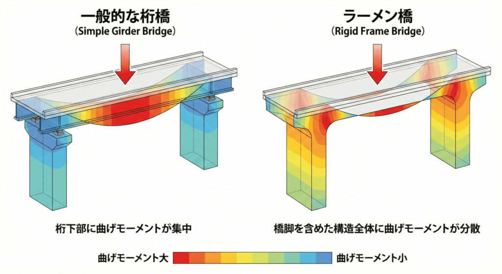 ラーメン橋では、橋桁にかかる曲げモーメントの一部を橋脚に伝達するので、力が分散されて橋桁の負担が少なくなります。これにより、橋桁を薄くすることができ、経済的でスリムな設計が可能になるのです。