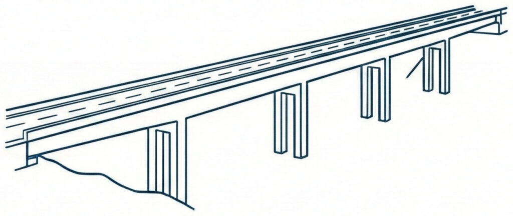 橋脚と桁が剛結する構造が、3つ以上の橋脚にまたがって切れ目なく連続する形式です。通常の橋は、橋脚ごとに分かれていますが、連続ラーメン橋は数メートルにわたり一本でつながっています。