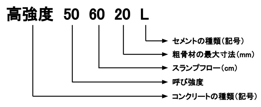 また、製品はセメントの種類や呼び強度など、それぞれを記号や数字で順に表示する、ということもJISに記載されています。具体的には次のとおりです。