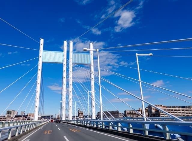 斜張橋とは、塔からケーブルを張り出して、それを橋桁につないで橋全体を支える構造の形式です。ケーブルが放射状に広がる幾何学的な美しさが特徴で、横浜ベイブリッジや多々羅大橋など、多くのランドマークとして親しまれています 。