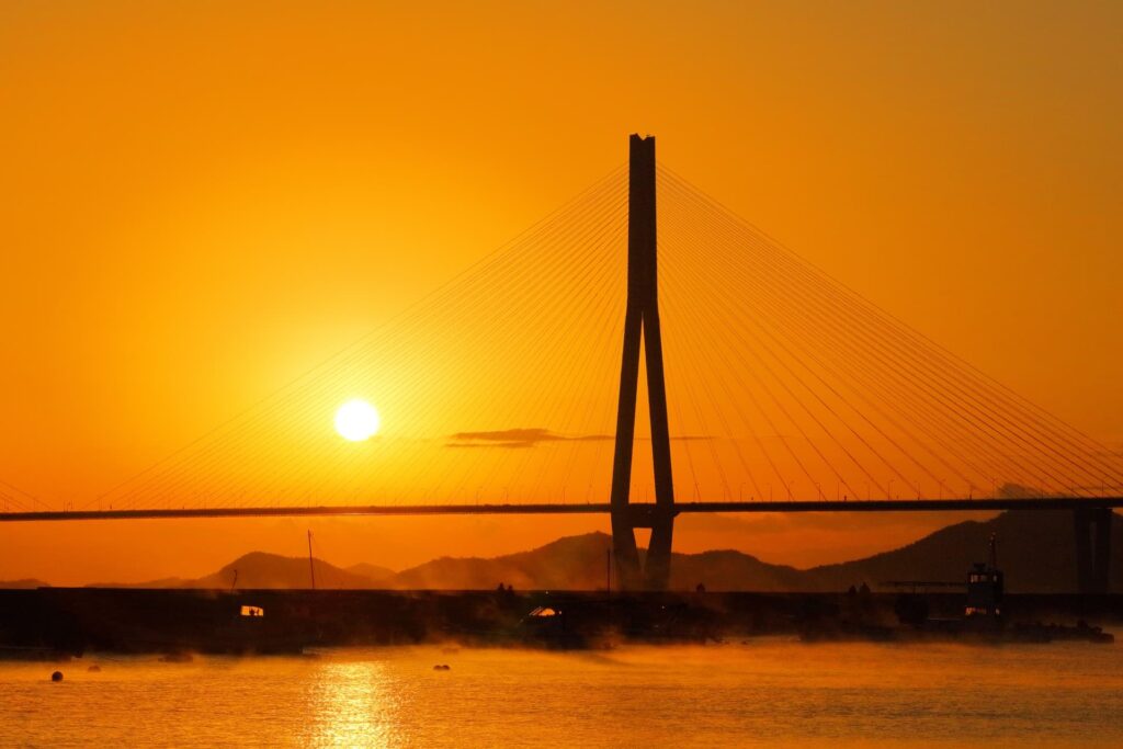しまなみ海道を構成する橋で、中央支間長が890mと完成当時(1999年)は世界最長の斜張橋でした。当初は吊り橋として計画されていたものの、斜張橋技術の急激な進歩により斜張橋に変更された、というエピソードがあります。