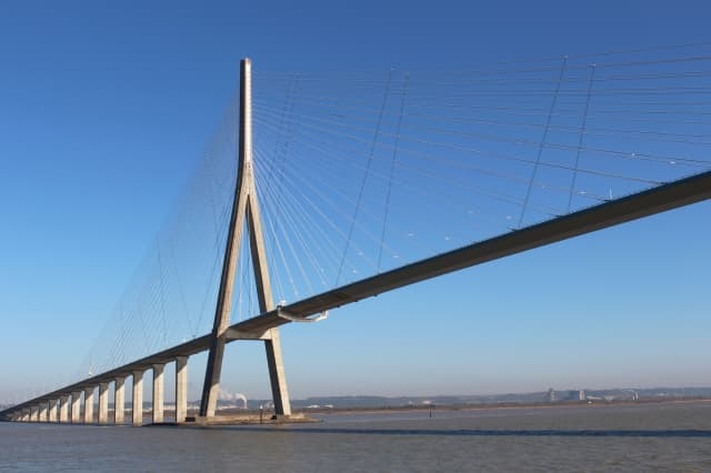 セーヌ川の河口にかかるノルマンディー橋は、中央支間長856mで完成当時(1995年)は世界最大規模でした。景観性の高い橋として有名です。