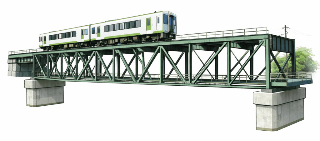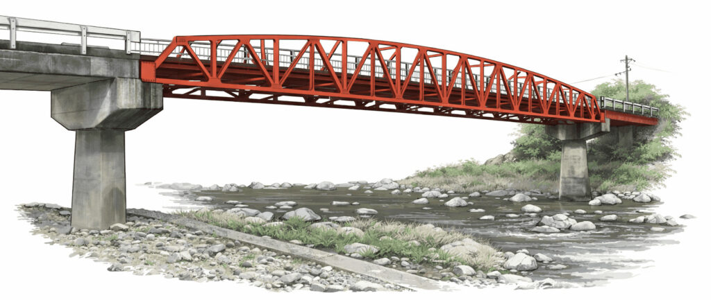 トラス橋は構造上、ある程度の高さが必要になります。高さを抑える工夫もあるものの、基本的には上空、あるいは桁下への空間占有が大きい形式です。