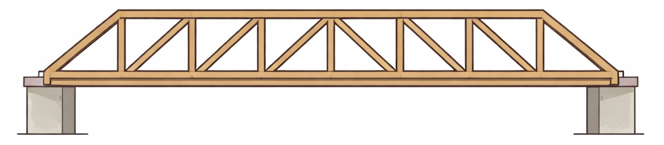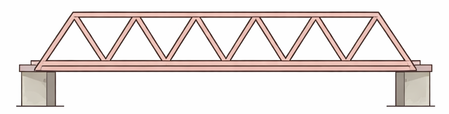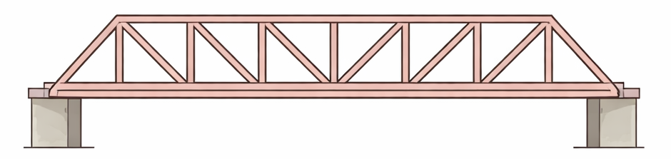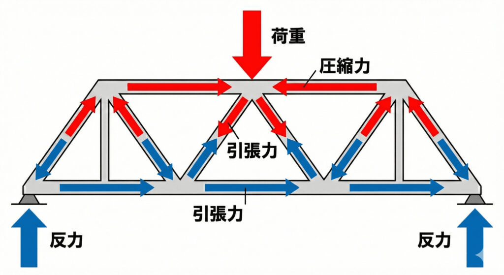 通常の橋梁は、上から荷重がかかると橋全体が弓なりに曲がろうとします。しかし、トラス橋はこの曲げる力を、部材の長さ方向に働く力(圧縮力と引張力)に変換する仕組みになっています。