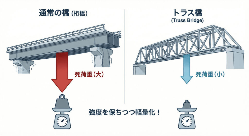 形が崩れにくい三角形を採用することで、橋全体の骨組みが安定します。これに加えて、トラス橋は部材の無駄を極限までそぎ落としていることが重要なポイントです。