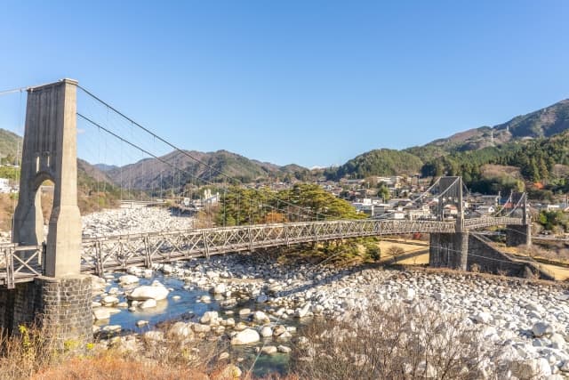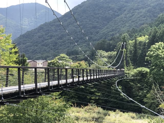 長野県にある桃介橋(ももすけばし)は、木造の補剛桁をもつ歴史的な吊り橋です。1922年に完成した全長247mのこの橋は、近代化遺産として重要文化財に指定されており、「桃の橋」とも呼ばれています。