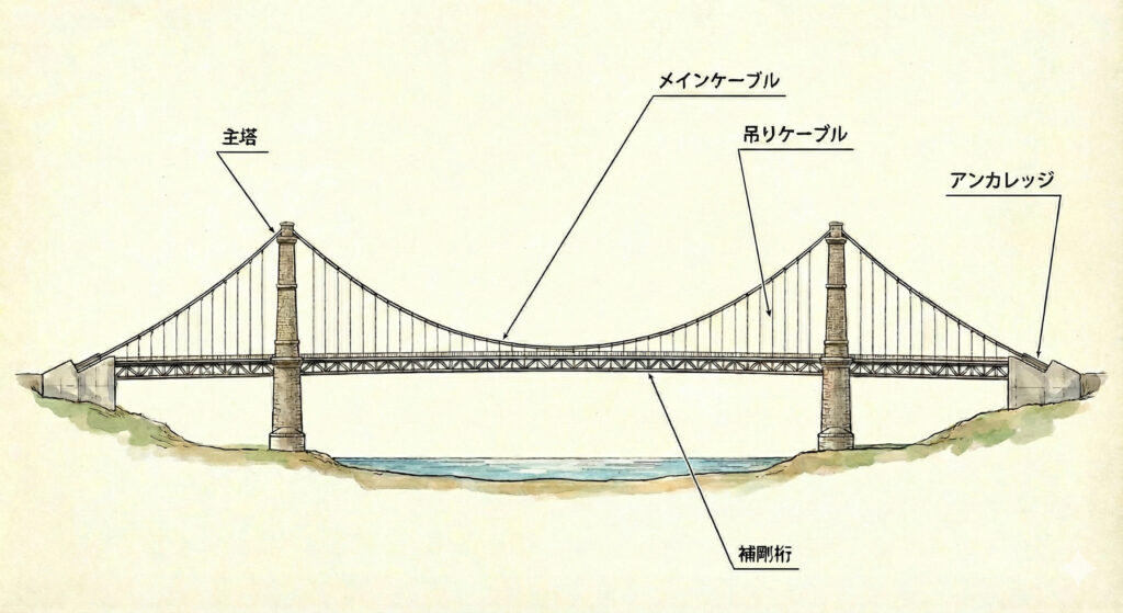 吊り橋を構成している主な部材は以下の5つです。それぞれの役割を解説します。